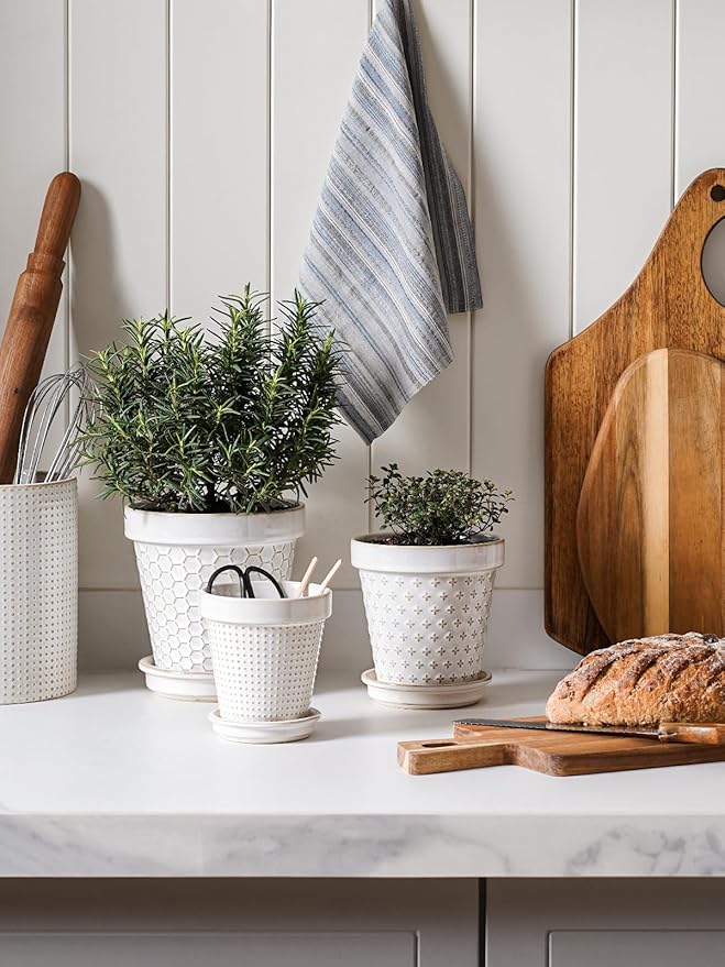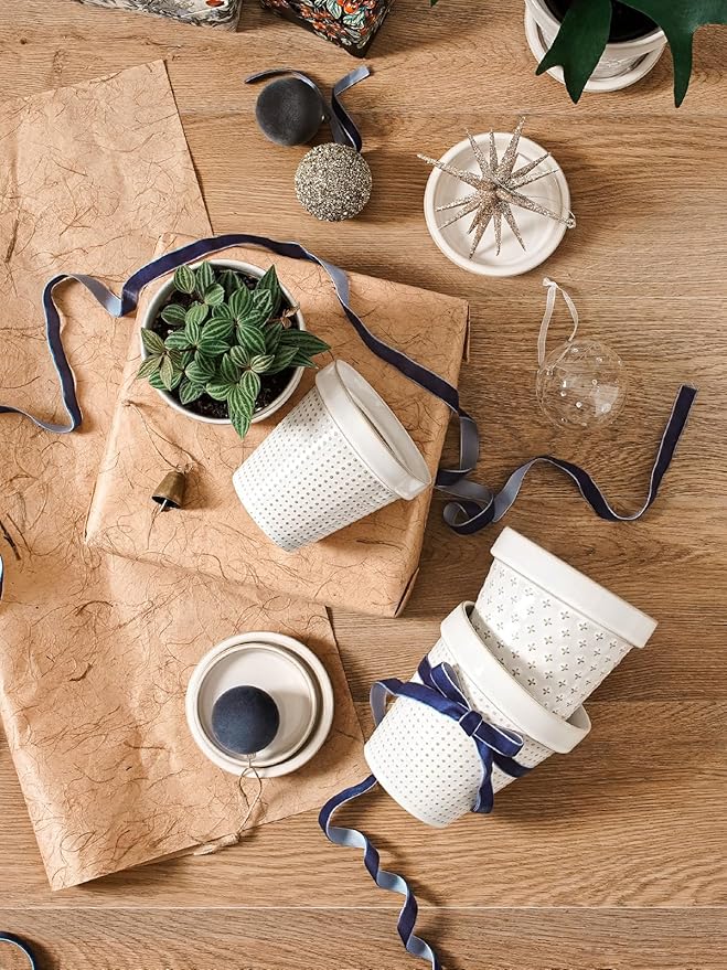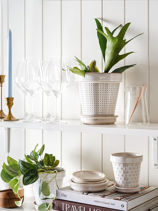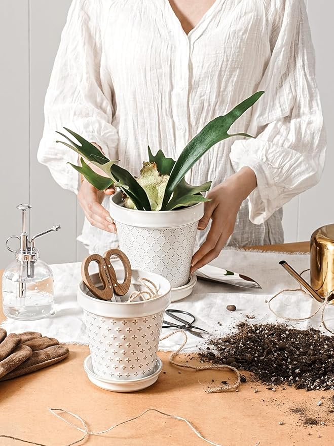 - Decor Living Space: Discover a cute embossed design in a compact 5.9-inch size – good for small and medium sized plants and flowers such as succulents, African violet, vanilla, basil, etc. . These ceramic flower pots add a touch of green to tables, windowsills, balconies, or bookshelves. The delicate balance of embossed design and botanical vitality converges, creating an atmosphere of unparalleled grace and visual delight