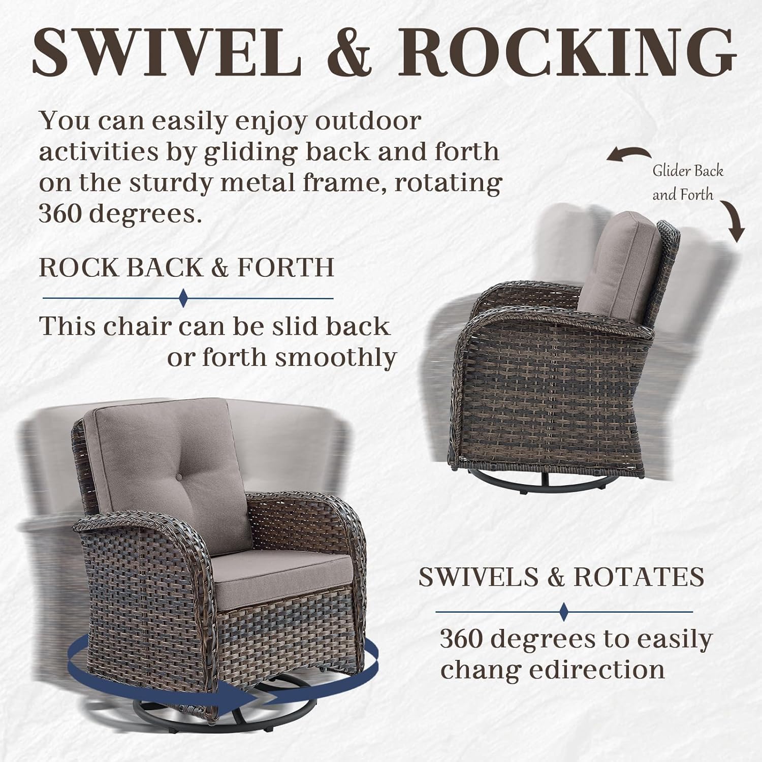 - Swivel Rocking Chairs:Resting on chairs with sturdy round metal base allows to glide gently and swivel 360° for relaxing, with seat and back cushions contribute to comfortable support, making the outdoor set a perfect addition to transform your patio.
