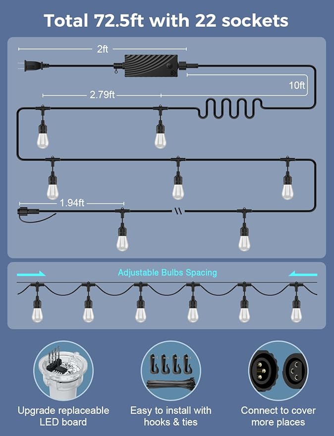 - Shatterproof and IP65 Waterproof: LED bulbs are made from durable plastic, resistant to accidental drops and bumps. This outdoor string lights waterproof ensures both lights and adapter fit for outdoor use, and last with a 30,000-hour lifespan