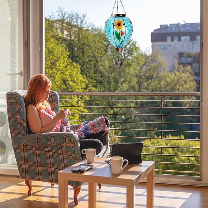Starsoul Large Solar Hot Air Balloon Lantern with Flame Sunflower Glass Hanging Outdoor Hot Air Balloon Solar Light Waterproof Garden Patio Yard Party Decorations
