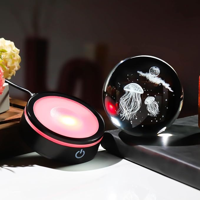 - Great Home Decor: The crystal jellyfish ball is an eye-catching home decoration, perfect for display on a table, wall shelf, fireplace, or desk, with a multi-color lamp base, it can be used as a decorative accent during the day, and it will shine under the light emitted by the bracket at night, adding warmth to the space and can be used as a cozy night light
