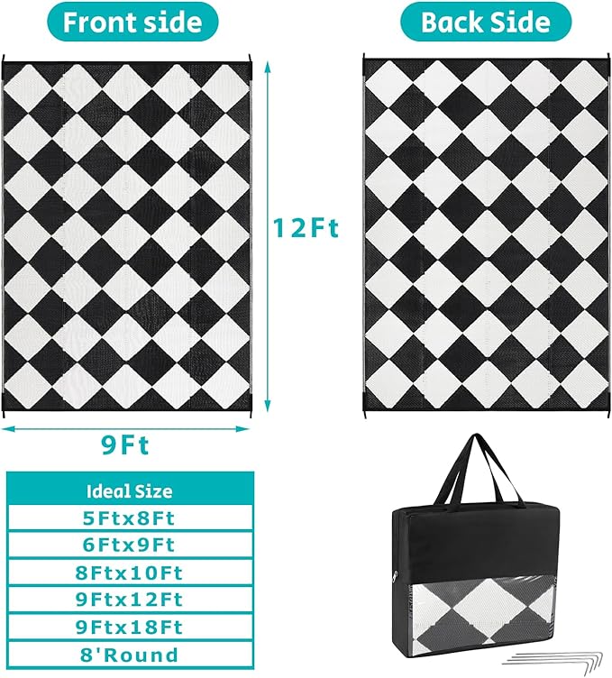- Versatile Outdoor Carpet: The indoor outdoor plastic rugs have multiple choice in different colors(4'x6',5'x8',6'x9',8'x10',9'x12',9'x18',8'round), is ideal for a variety of indoor outdoor activities,like patio mat, deck rug, garden rug, beach mat, picnic mat, BBQ party mat, rv camping rug,pool rug,outdoor doormat,garage rug,front door mat,allowing you to have plenty of imaginable space for more fun.