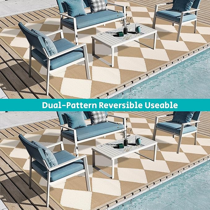 - Reversible Outdoor Rugs: Featuring a classic moroccan pattern on both sides, this rectangular 9x12 ft outdoor area rug allows you to instantly refresh your patio, porch, backyard, deck, RV campsite. And this outdoor deck rug is reversible, two-sided design allows you to have two different looks,both sides can blend perfectly with nature and look very full and comfortable.