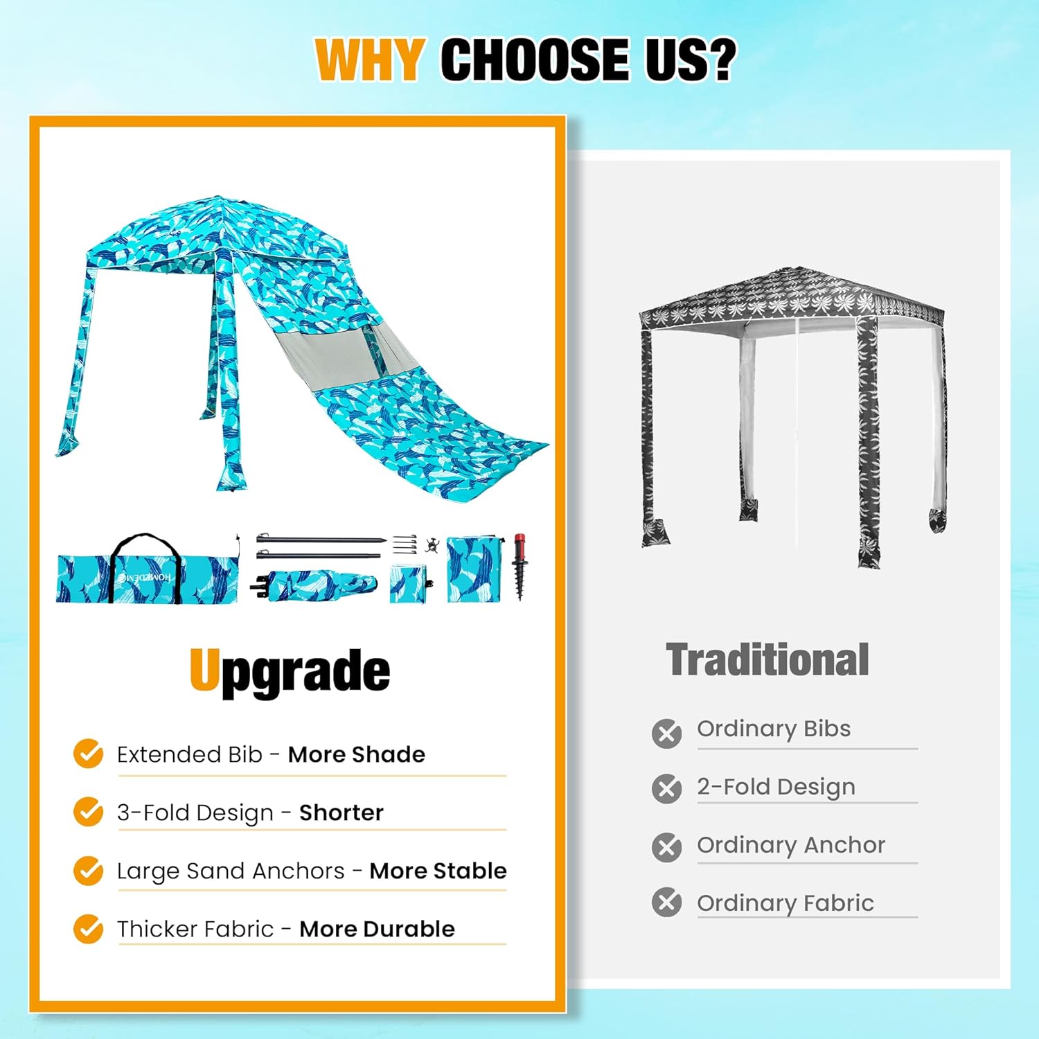 - UV Protection and Waterproof: The beach sun shade canopy has a UV50+protection and dual sided ventilation performance, so that You don't worry skin burns by the sun. The beach canopy tent sun shade can provide short-term shelter from the rain without deformation, and it can quickly dry out after being soaked in the rain.Air-vent designed to facilitate air flow for more stability.