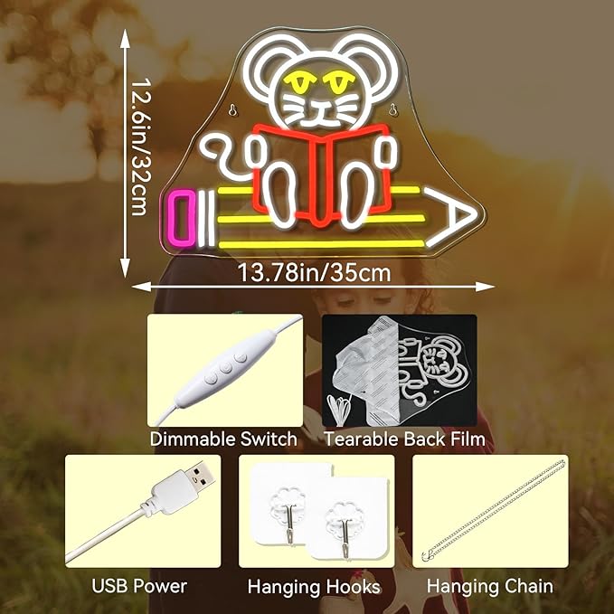 Pencil Mouse Neon Sign Mouse Book Reading Neon Lights for Wall Decor Dimmable Colorful Light Up Sign for Classroom Bookstore Library Bedroom Bookish Museum Teen Gifts (USB Powered 5V/2A)