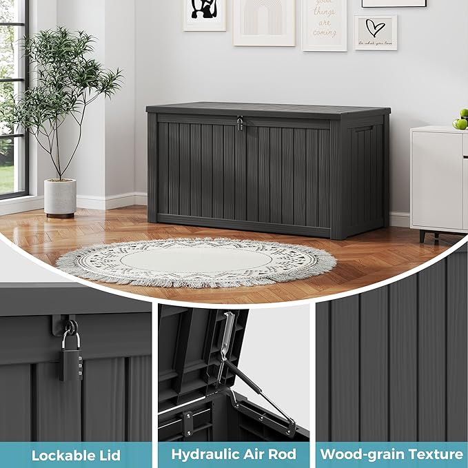 - 🏕️【Convenient Hydraulic Lid System】Featuring a hydraulic piston system, the lid of this outdoor storage bin opens effortlessly and closes softly. The user-friendly design ensures safe and smooth operation, making it ideal for everyday use.