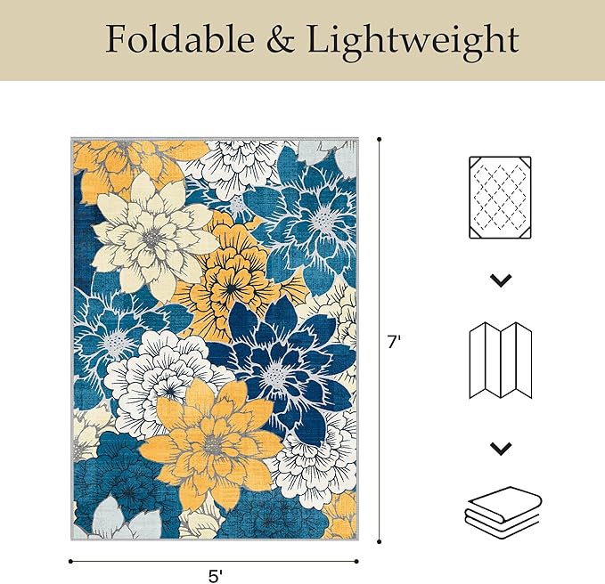 GENIMO Indoor Outdoor Area Rug 5' X 7' Waterproof, Washable Patio Rug Non Shedding, Easy Cleaning Floral Outdoor Carpet for Living Room, Bedroom, Dining Room, Balcony, Backyard, Deck, RV, Blue