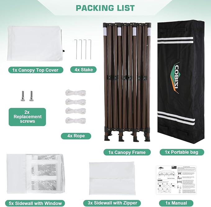- 【Included Accessories, Warranty Service】 1x Commercial Grade 10x30 Pop Up Tent Frame, 1x Top Cover, 6x PU Coated Panels (4 x Sidewalls with Windows and 2x Sidewalls with Zippers), 8 x Ground Pegs, 4x Windproof Ropes, 1x Carrying Bags, 1x Manual. We provide 1 year warranty service. If you have any problems and questions, please feel free to contact us, we will give you the best help. Choosing us means choosing a comfortable life.