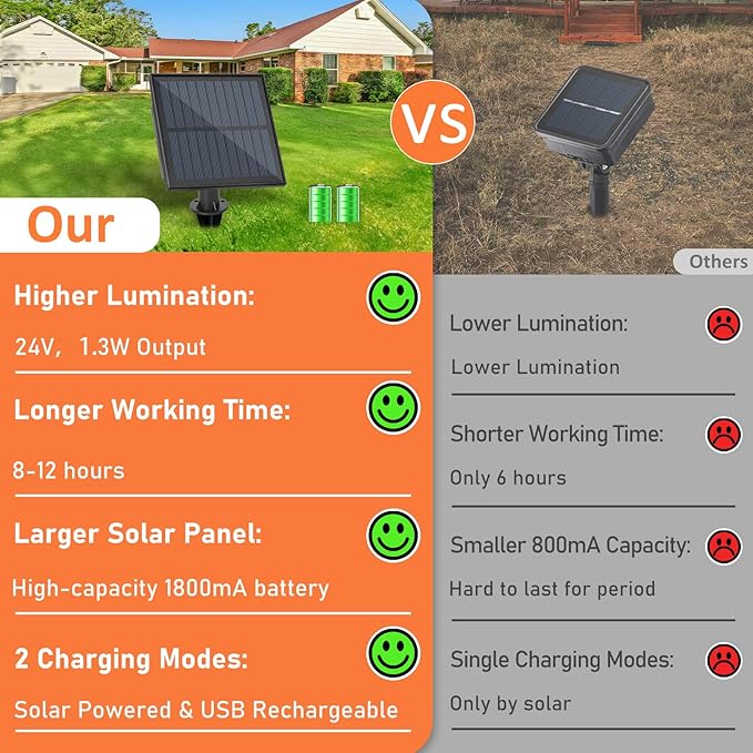 - 【Easy installation & Widely Used】Our solar powered string lights can be placed anywhere, either stuck into the ground or fixed to a wall. Designed with easy-to-install cup hooks on each bulb, these LED outdoor string lights are incredibly flexible and practical, making them perfect for a variety of spaces such as patios, backyards, decks, bistros, cafes, pergolas, gardens, markets, and more. Please feel free to reach us at any time if you have any problems or require assistance.