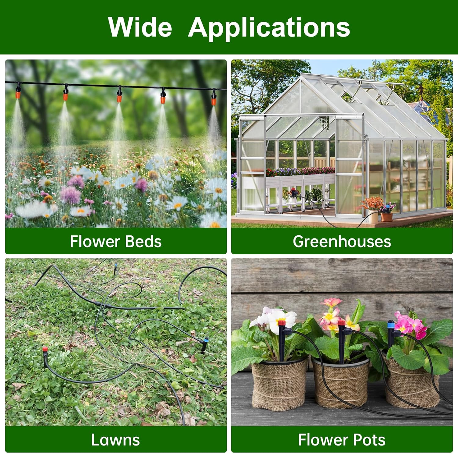 - Wide Applications: This Drip Irrigation System designed for outdoor space is suitable for Flower Beds, Greenhouses, Lawns, Gardens, Raised Beds, Flower Pots, Atomization, Roof Cooling, Vegetable Beds, Swimming Pool Mist Cooling and more. Our Drip Irrigation Kit meets your irrigation needs for different scenarios, making your plants well-maintained and thriving.