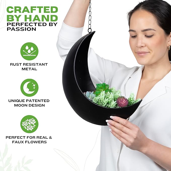 - Celestial Beauty for your space: Inspired by the cosmos, our unique Patented Hanging Crescent Moon Planter adds a touch of celestial charm. Its matte black finish perfectly complements any indoor or outdoor space, adding a whimsical and mystical vibe. It is perfect for hanging succulents that require little water and shallow depths.
