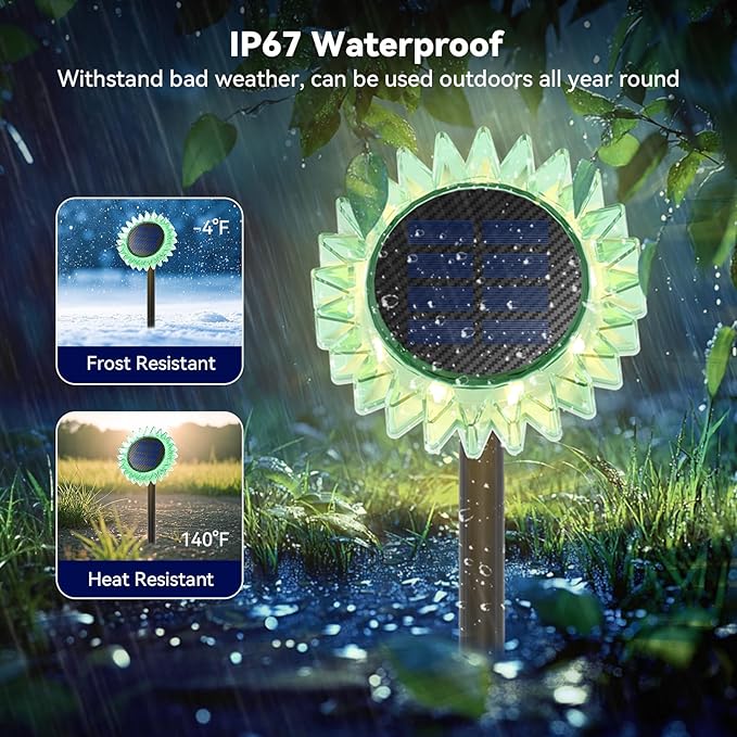 - Solar Garden Lights Outdoor Design: Use of exclusive patent solar sunflower shape light with omni-directional rotation function, pistil center solar panel sunlight-facing, like a sunflower that feels alive. Multi-thread LED strip makes it 60% brighter than regular outdoor decorations lights, creating warmth and vibrancy to your outdoor space that will captivate passersby