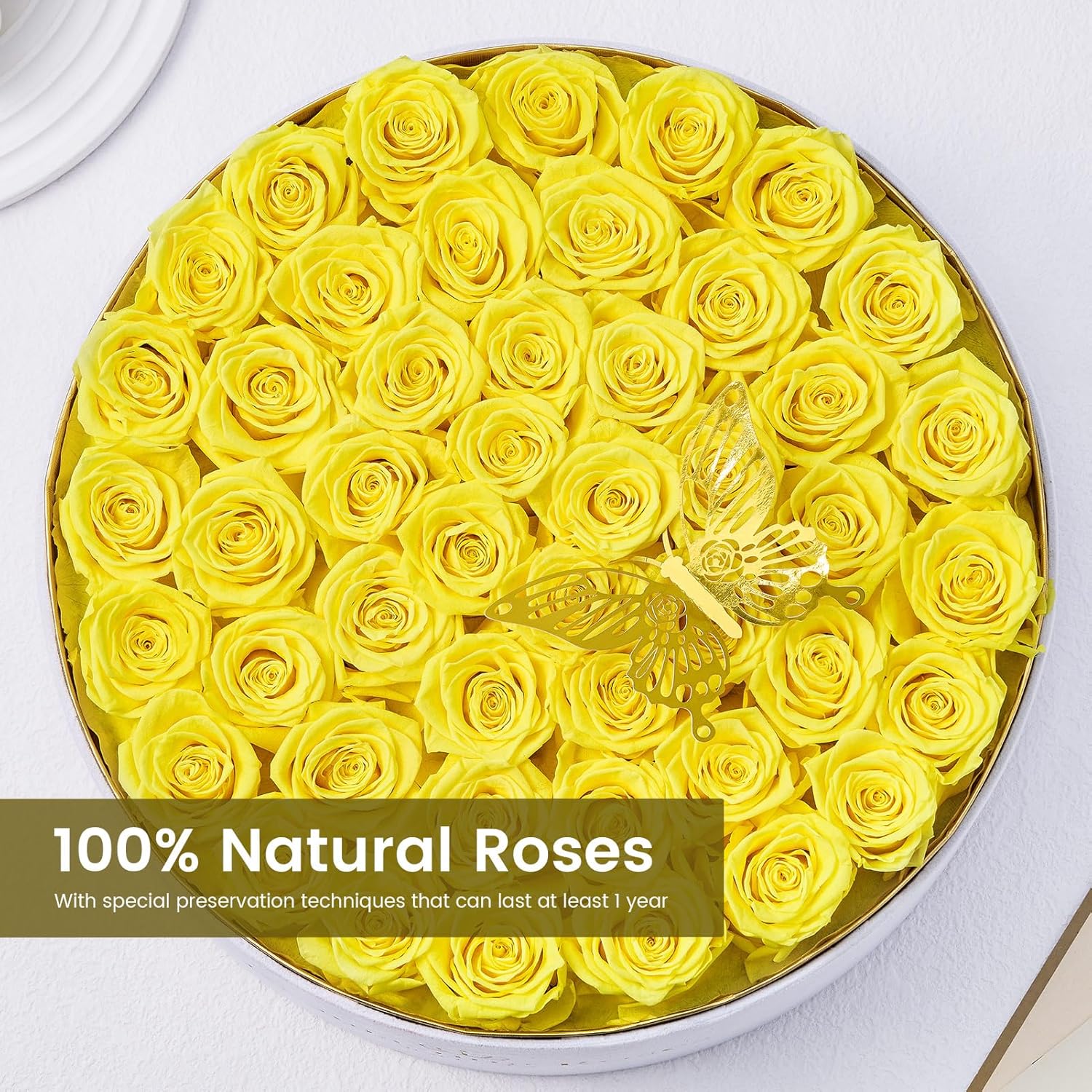 - Elegant display box: The high-quality round white velvet box feels luxurious and understated, putting all the focus on the 47-piece bright, everlasting roses - a timeless gift your loved one will enjoy for over a year. The PVC transparent cover also displays the preserved roses well