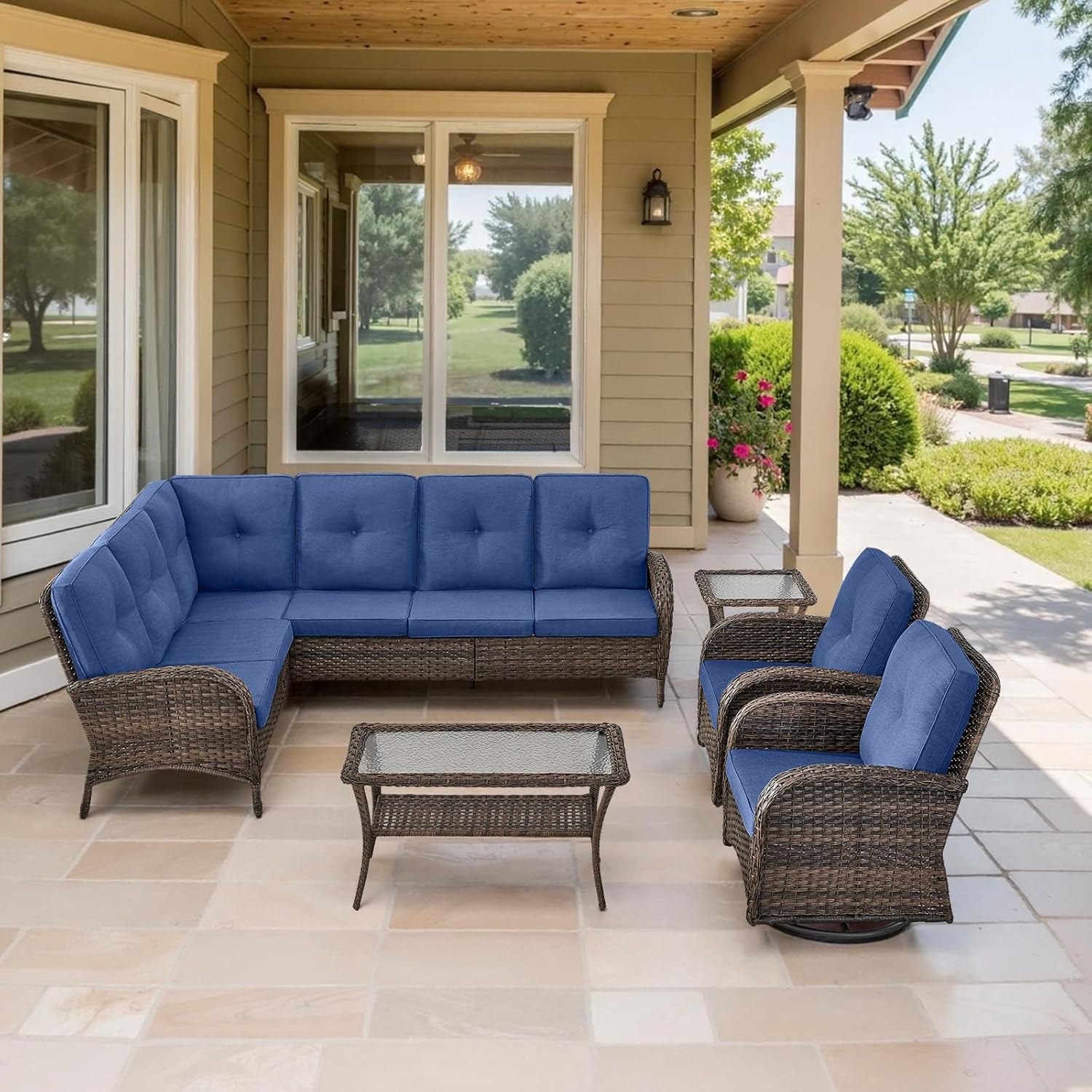 - Complete Patio Furniture Set Details: Transform your patio into a stylish haven with this 6-piece outdoor patio furniture set. This patio conversation set offers versatility and elegance for gatherings or quiet relaxation, featuring an L-shaped outdoor sectional sofa, an outdoor swivel glider chair, a sleek wicker coffee table, and a matching side table.