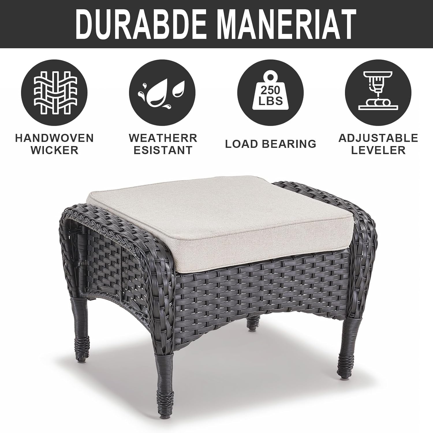 - Versatile & Stylish Design:The coordinated pieces of this outdoor patio conversation set allow flexible layouts to suit your space. Use the ottomans as footrests or additional seating, and arrange the side tables for easy access to drinks and snacks. The sleek, modern aesthetic blends seamlessly into any outdoor decor.