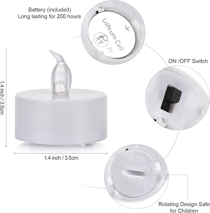 - 5.PACKAGE INCLUDE – 50 LED Flameless tea lights. Batteries are included and installed. On/Off sliding switch makes it easy to use.