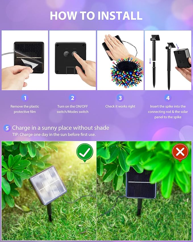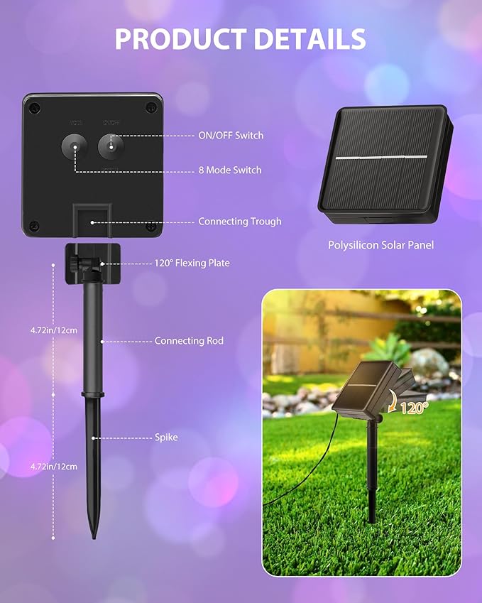 - 【Auto On/Off & Easy Installation】Solar outdoor lights fully charged under direct sunlight for 4-6 hours, they can work up to 8-10 hours at night, the outdoor solar lights automatically turn on at dusk and auto off at dawn. Also, solar outdoor string lights with ground stake is easy to install, just stake into the ground, and our string lights have soft light cords, very suitable for DIY any shape.