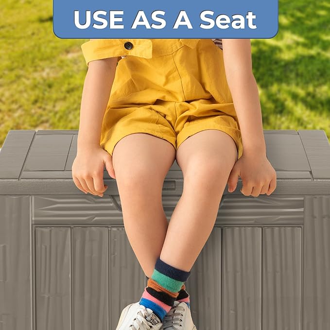 - Our deck box offers an impressive storage capacity, perfect for organizing patio cushions, pool accessories, gardening tools and more. This multipurpose storage solution not only helps keep your outdoor space tidy but also functions as a bench or table. Whether in your backyard or on the patio, this deck box is designed to meet your every need.