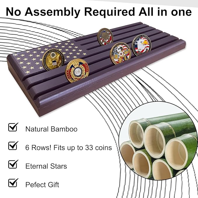 - 🌟 【6-ROW MILITARY COIN HOLDER DISPLAY WITH LASER STARS】: Made of high quality natural bamboo wood material for durability, this challenge coin display holder holds 30-36 standard challenge coins securely with grooves. Non-slip pads protect the surface.