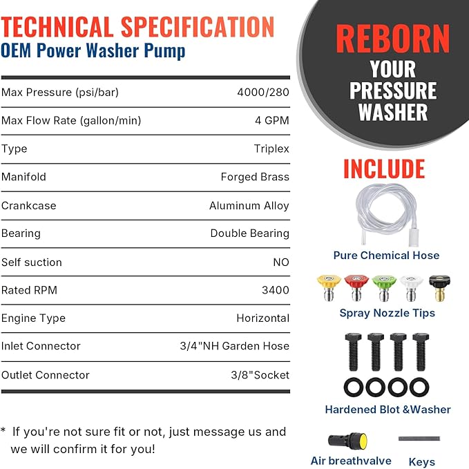 - [Super Powerful] The powerful power combination (4000PSI ultra-high pressure and 4 GPM high water flow rate) can easily break down heavy stains, grease, and deep dust, covering a variety of scenes such as courtyards, vehicles, industrial equipment, etc., significantly improving cleaning efficiency and meeting the needs of professional users.