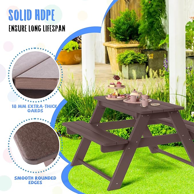 Costaelm Kids Picnic Table, HDPE All Weather Outdoor Toddler Picnic Table and Chair Set Kids Bench for Patio, Backyard, Garden, Lawn, Dark Brown
