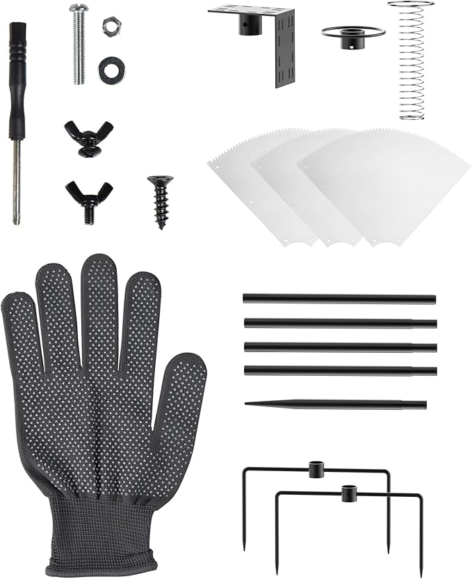 - 【Easy Installation】 This 90 inch bird feeder stand includes 6.5-inch 5-prong bases, 6 connecting poles, an L-shaped plate, and a squirrel baffle. The slip-in connection makes assembly as easy as stacking blocks, while the wing nut design enables tool-free, adjust the baffle 8-10" above ground to stop squirrels, one-person setup in about 30 mins. This user-friendly design ensures everyone from young enthusiasts to seniors can assemble effortlessly.