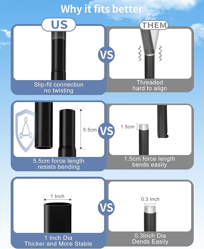 - 【Pole for Long-Lasting】The 5-prong base features a reinforced weld design for solid ground support, preventing breakage and ensuring durability. The thicker pole, 1-inch diameter and 1mm thickness, connects via a slip-in method for a depth of up to 5.5 cm between poles. This design is much stronger than the 1cm threaded connections, offering improved resistance to bending and breakage. It provides ample weight capacity, perfect for enduring storms, winter snow, and multiple bird feeders.