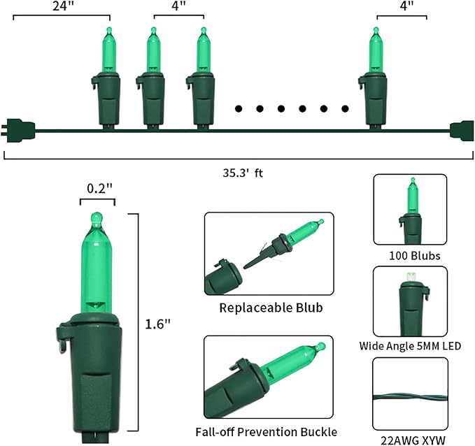 - 【Mini Christmas Lights Specification】: 1 Sets - white wire chritsmas light string includes 100 count green LED lights, total length 35.3ft, lights length 33ft and each led is 4 inches apart, 24 inches lead wire, 4 inches end connector (Extra 2 x bulbs and 1 x fuse included)