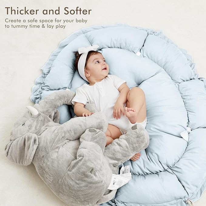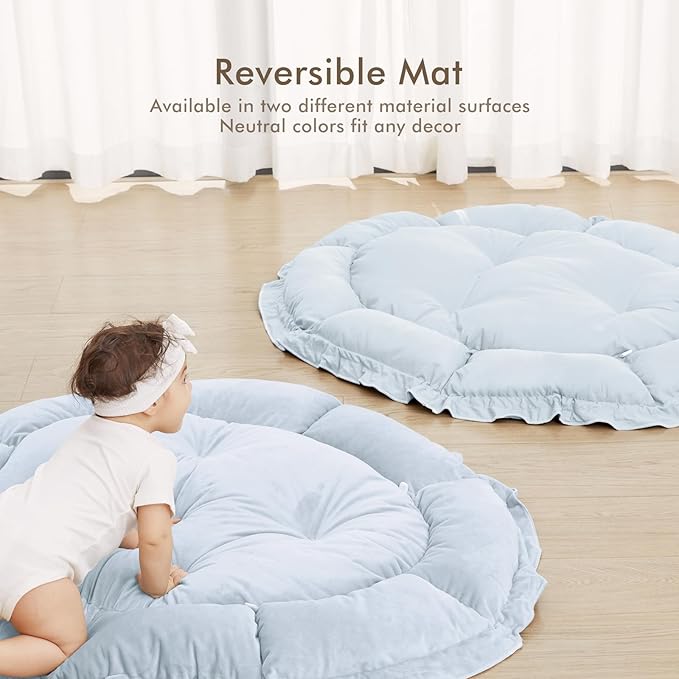 - THICKER & SOFTER: The reversible play mat crafted from premium plush material, offers a fantastic amount of cushion. Its neutral color scheme blends in with your home’s aesthetic so you can keep it out even after playtime is over.