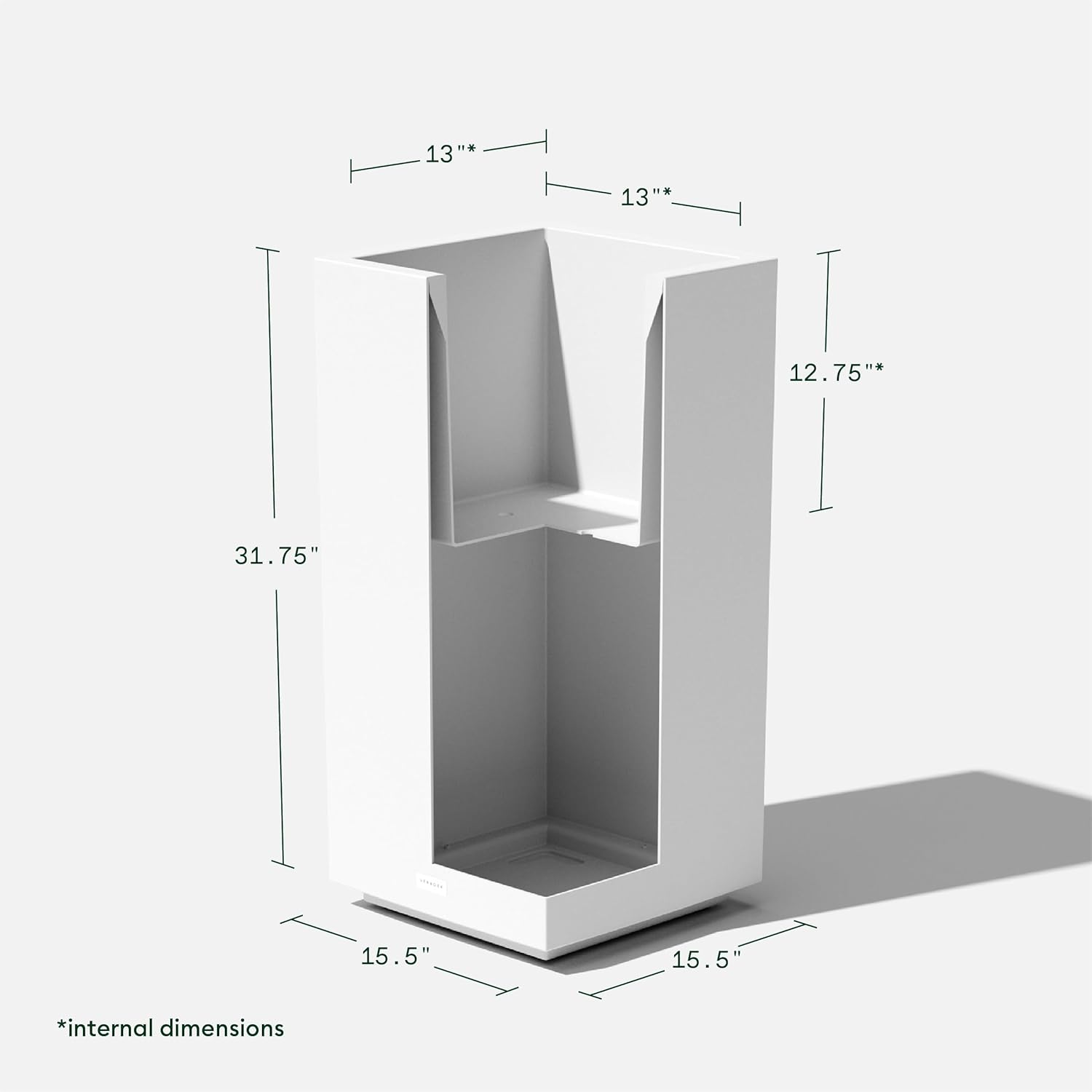 - DIMENSIONS & DETAILS: This double-walled planter’s exterior dimensions measure 31.75” in Height, 15.5” in Width, 15.5” in Length. With the removable insert bucket installed, the interior dimensions measure 12.75” in Height, 13” in Width, 13” in Length. It comes fully assembled for easy use