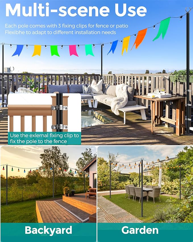 - Versatile Use for Multiple Occasions: Featuring a stylish design and elegant black finish, the string light pole is not only functional but also enhances the aesthetics of outdoor lighting, ideal for use in patios, gardens, backyards, lawns and more, creating a magical atmosphere for any outdoor event. Allows you to safely and easily hang a variety of home and garden decorations including string lights, lanterns, flags, balloons, garlands, ribbons or wind chimes etc.