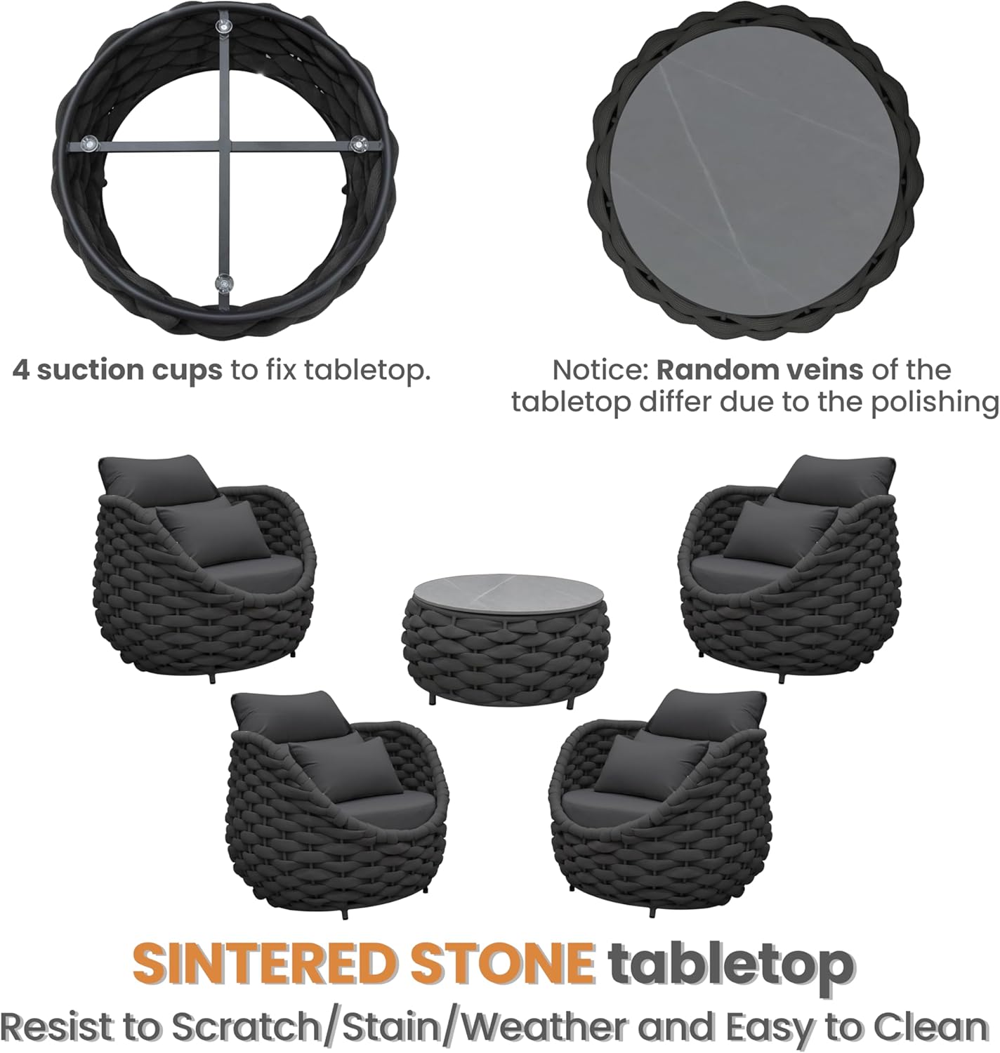 - Easy cleaning and scratch-resistant sintered stone tabletop is fixed by 4 suction cups. Cushions cover replaceable removal and machine washable. Adjustable nylon feet levelers for uneven floor also prevent scratching