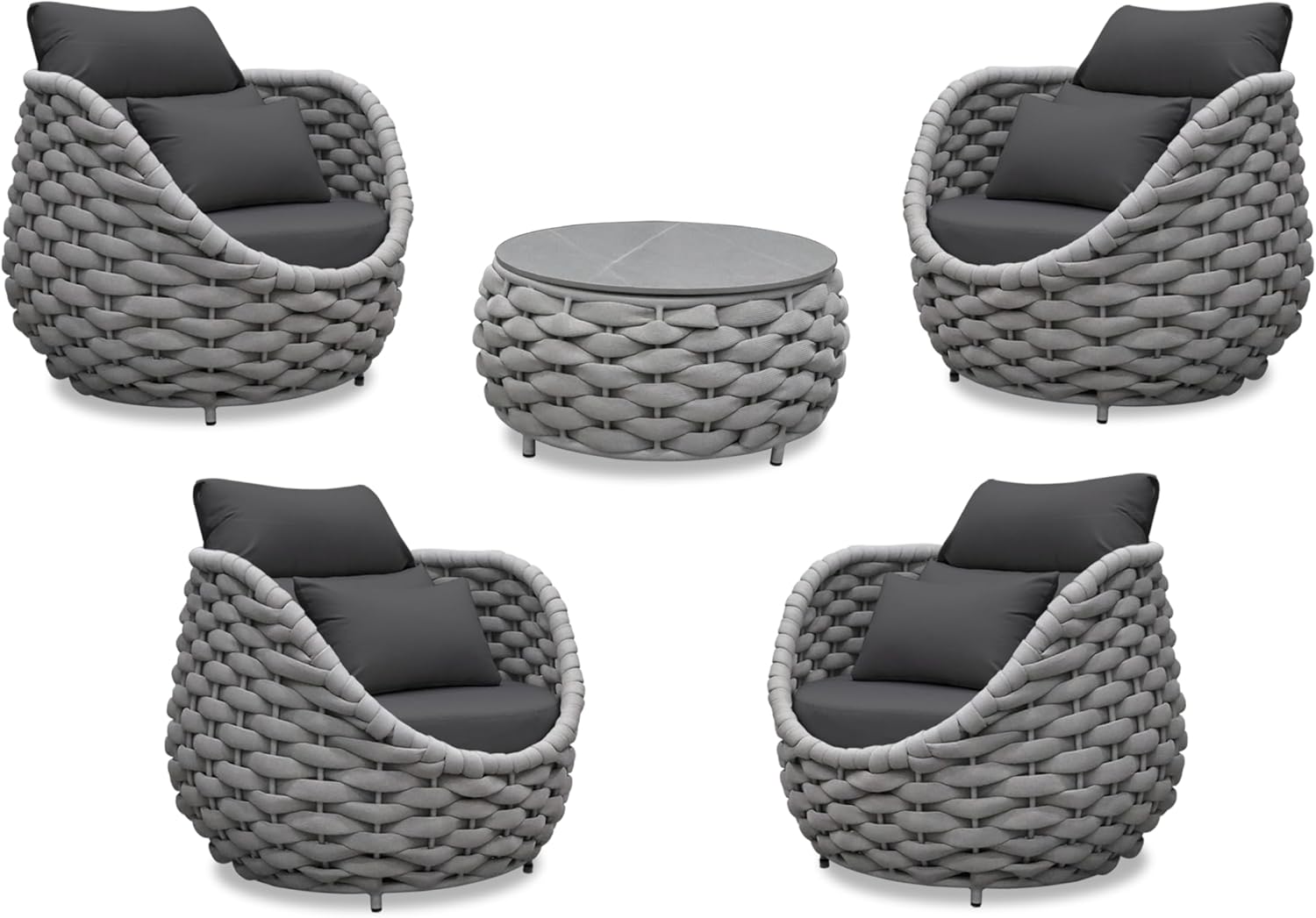 - Furniture set is crafted from reinforced rust-free aluminum alloy frame, wrapped in hand woven textilene rope. The 5 pieces all weather patio upholstered conversation set resists to UV, rain, wind, salt water. Perfect for indoor outdoor even arid or coastal areas