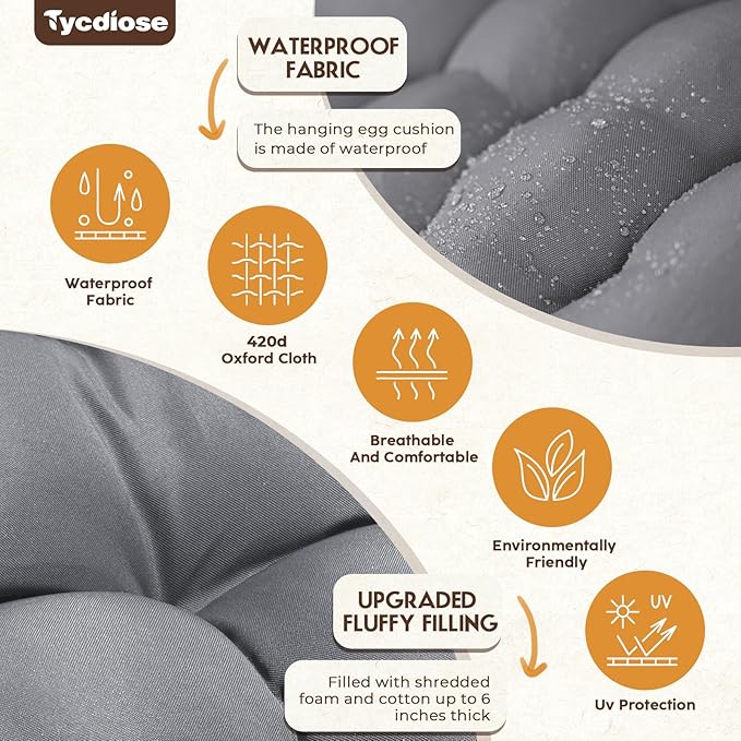 - 🛒【WATERPROOF FABRIC】-Tycdiose egg chair cushion is made of waterproof, UV-resistant Oxford fabric, which is soft and skin-friendly, durable and suitable for indoor outdoor patios, garden porches and sunrooms. Note: If rainwater stays on the 3D seams (grooves) of the egg chair cushion for a long time, it may seep in and wet the egg chair cushion.