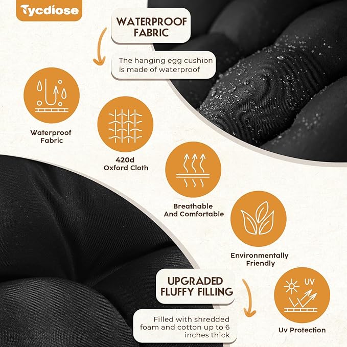 - 🛒【WATERPROOF FABRIC】-Tycdiose egg chair cushion is made of waterproof, UV-resistant Oxford fabric, which is soft and skin-friendly, durable and suitable for indoor outdoor patios, garden porches and sunrooms. Note: If rainwater stays on the 3D seams (grooves) of the egg chair cushion for a long time, it may seep in and wet the egg chair cushion.