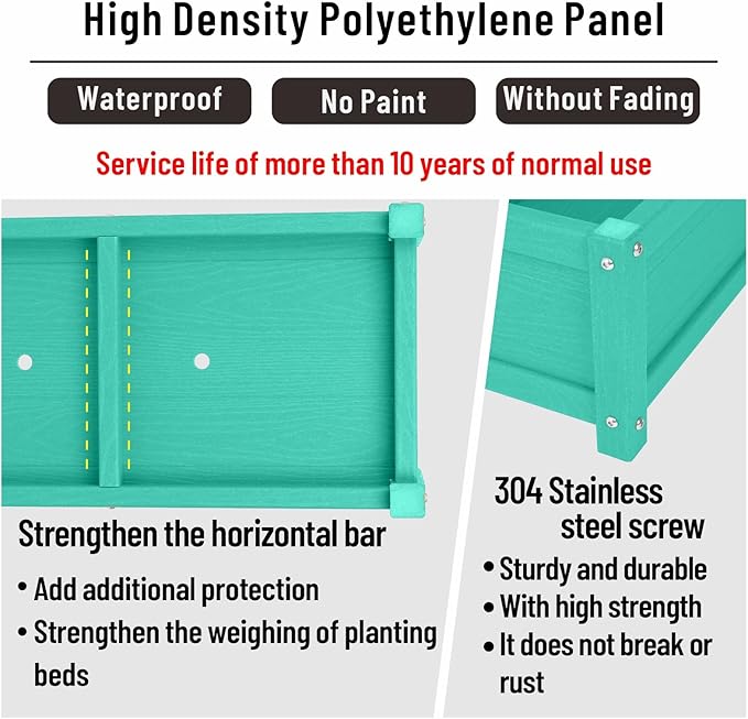 - Safety:Raised planter box outdoor made from HDPE,with no water or oil-based coatings, ensuring that your fruits, vegetables, plants, and herbs grow safely