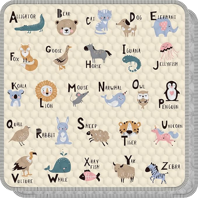 - Educational & Engaging Patterns – Featuring bright and colorful alphabet and animal designs, this mat stimulates your baby's curiosity and promotes early learning. The fun patterns help your baby recognize letters and animals while encouraging sensory development and imaginative play.