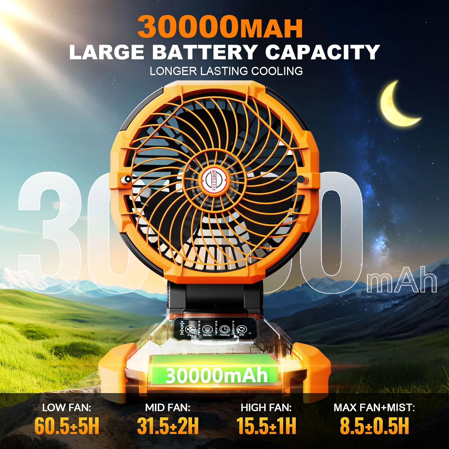 - 30000MAH HIGH CAPACITY: This battery-powered misting fan, built-in 30000mAh battery, fully charged in 5.5 hours, it can provide 6-8 hours (high fan + misting) or 15-60 hours (fan only) working time, meeting your needs for long-term outdoor and work.