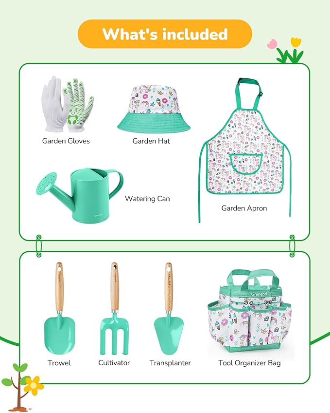 - Durable and Rust Proof: Grenebo kids gardening set is crafted from premium-quality materials with reinforced handles, ensuring it withstands long-term use without damage or rust. It offers enhanced durability and stability, so kids can play as wildly as they want without any worries!