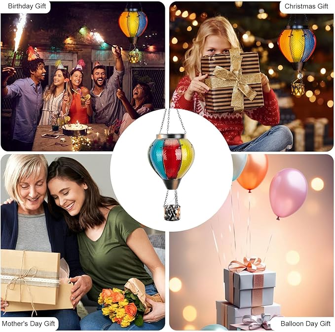 - 【Unique Hot Air Balloon Design】--This hanging solar light is composed of 8 pieces of stained glass with lifelike flame lights. As night falls, their glow adds warmth and comfort to your garden, patio, yard, path, and more, great Christmas decorative lights.