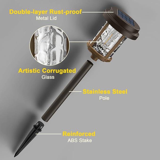 - BUILT TO LAST: Solar lights outdoor made with premium materials: artistic corrugated glass, stainless steel pole, thickened ABS ground stakes which penetrate hard soil. Rust-resistant powder coating adds extra weather resistance and a vintage metallic finish.