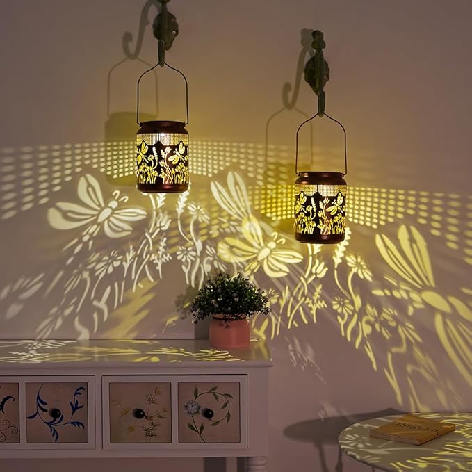 - EXQUISITE PATTERN: YELENEW hanging solar garden lantern dragonfly light adopts retro hollow design with warm light with flower pattern,creating a gorgeous and warm atmosphere to bring happy life and fun to your garden.dragonfly solar lantern can casting beautiful patterns on the wall or lawn,2 pack solar dragonfly lantern SIZE:6.9"H x 4.7"W x 4.7"L