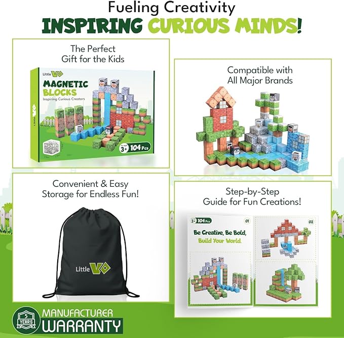 - 【104PCS Magnetic Building Blocks Set】 Dive into endless creative possibilities with our 104-piece magnetic cubes kit! Each cube is made with super strong internal magnets, perfect for kids aged 3-8. Build castles, cities, and even vehicles, sparking imaginative role-play and hands-on fun for hours. Compatible with other 1-inch blocks on the market for even more construction freedom.