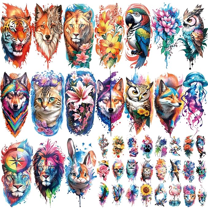 77 Sheets Temporary Tattoo, 17 Sheets Half Arm Flower Lion Tiger Cat Owl Parrot Waterproof Fake Tattoos for Adults Shoulder Neck, 60 Sheets Tiny Realistic Tattoo Sticker for Women Girls and Kids