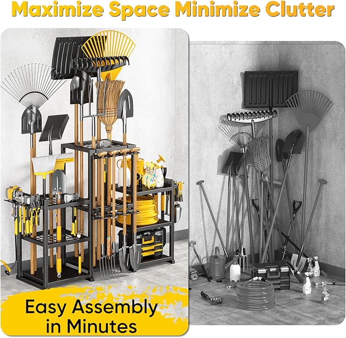 - MULTI-PURPOSE LAWN TOOL ORGANIZER FOR GARAGE: Ideal for garages, sheds, patios, and basements, this lawn tool organizer for garage stores rakes, shovels, brooms, and more. Its versatile design fits multiple spaces and keeps your lawn and garden tools perfectly arranged.