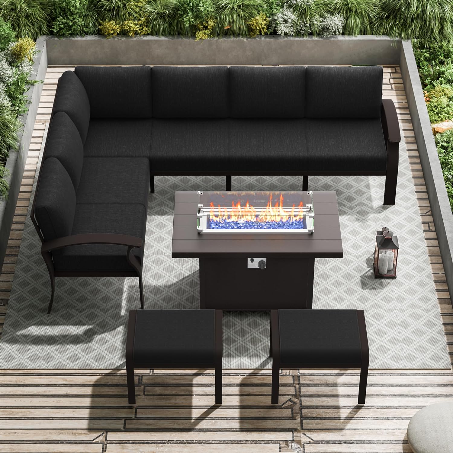 - OUTDOOR FURNITURE: Aluminum patio Furniture set including 1 six-seat corner sofa, 2 ottomans, 1 fire pit table. Patio furniture set has a variety of chairs for different scenarios of gatherings. This set consists of several parts, suitable for different scenarios of the party, you can according to their own preferences or needs for random combinations, and enjoy a happy time with your family and friends!