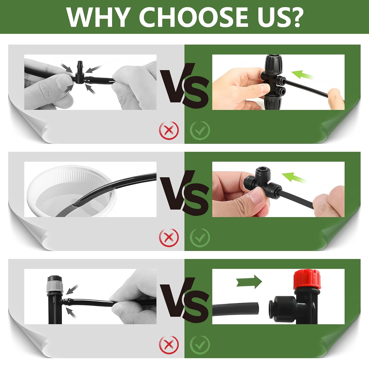 - 【Quick-Connect Fittings for Simple and Fast Installation】Our drip irrigation system contains quick-connect features. No hassle steps and tools required. Simply connect the components and start watering your large garden with minimal effort. This user-friendly design ensures you can set up your irrigation system quickly and saves your time and effort.