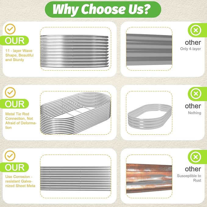 - 【Durable Galvanized Steel Construction】:Crafted with high-quality galvanized steel, this metal raised garden bed is built to last. The anti-corrosion coating ensures long-term durability, while the sturdy structure withstands heavy soil and weather conditions, making it perfect for outdoor use. Unlike traditional wooden garden beds, it resists warping and rotting over time.
