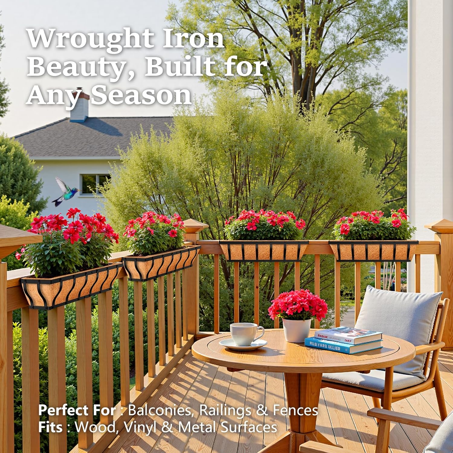 Railing Planter Boxes, Heavy Duty Window Box Planters, Adjustable Balcony Planters for Railing Hanging, with Coco Liner & Support Rod for Deck, Porch, and Patio Gardening (2 Pack, 24 Inch)