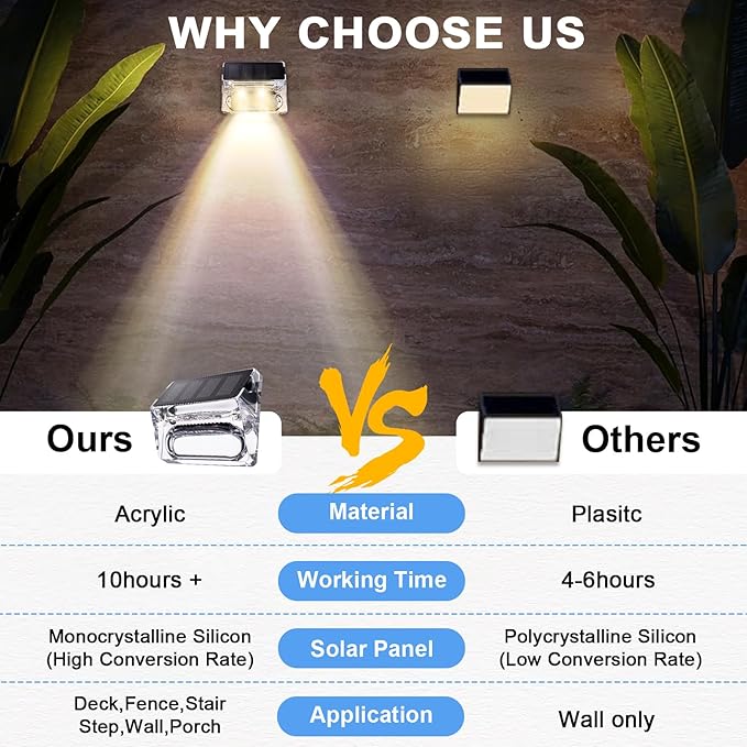 - 🔅【IP65 Waterproof & Long Working Time】The Solar Fence Lights are made of high-quality acrylic and high-strength ABS material, with an IP65 waterproof rating, ensuring the long-term durability of the step lights. In addition, the solar outdoor lights installed on the fence can withstand various extreme weather conditions, bringing you a more comfortable outdoor experience.